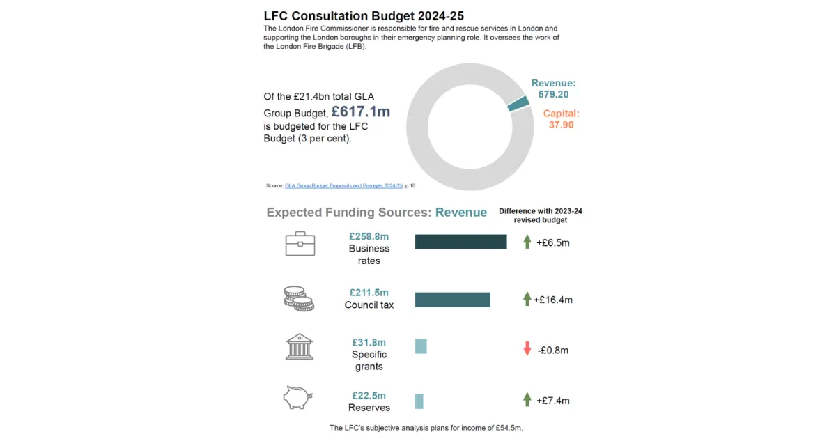 - Total revenue expenditure by the LFB of £621.7 million.1 This is a 0.1 per cent increase from £621.0 million forecast for 2024-25 and 7.3 per cent from the £579.2 million budgeted for that year.2 3