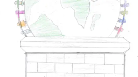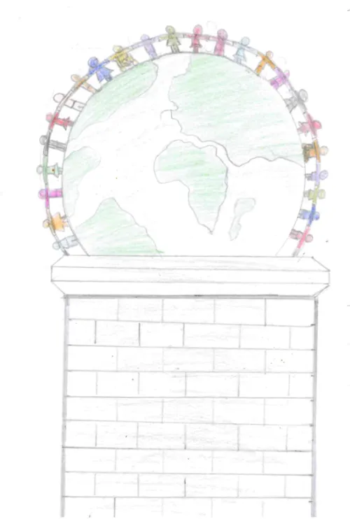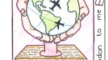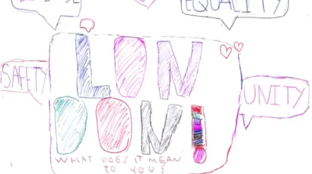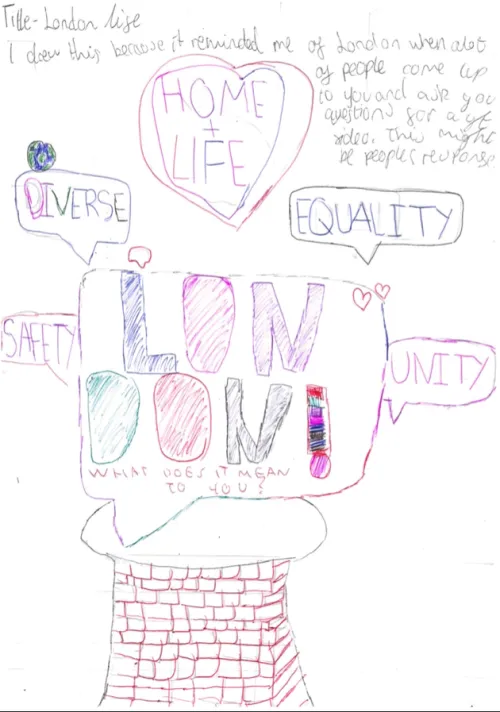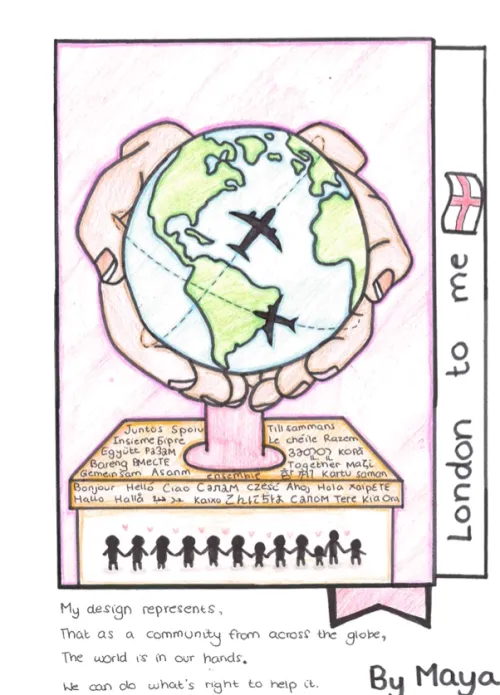 To me, London represents community and equality. No matter where you're from, your race, disability, or gender, you should be treated fairly and equally to everyone else. That’s why I drew the Earth with different people around it holding hands.