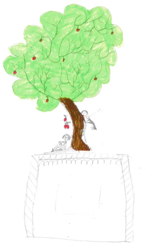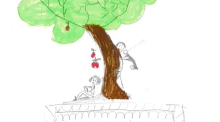 There’s a person cutting a tree and another sitting beside it. This represents how people are cutting down too many trees, even when many don’t want that to happen.