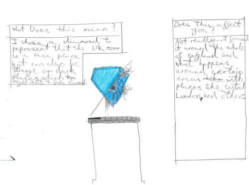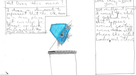 I chose a diamond to represent that the UK is a nice place but can also be a strange or dark place, which might relate to fake diamonds.