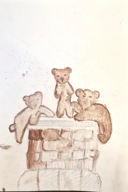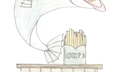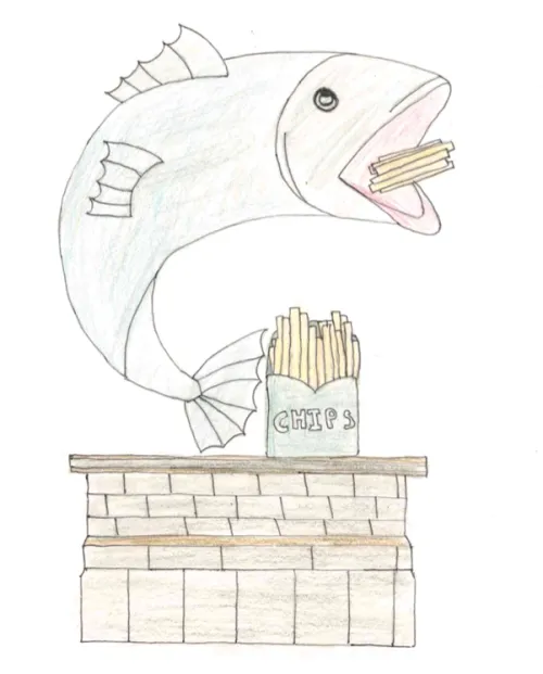 This drawing is inspired by the stereotype that "British people eat fish and chips on Fridays," highlighting a tradition in England dating back to the 1860s. Moreover, at school on Fridays, we eat the same dish, making it a well-known item on the menu.
