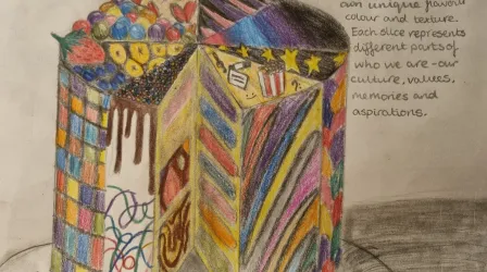 This cake is made of various unique slices, each of them with their own unique flavour, colour and texture. Each slice represents different parts of who we are - our culture, values and aspirations.