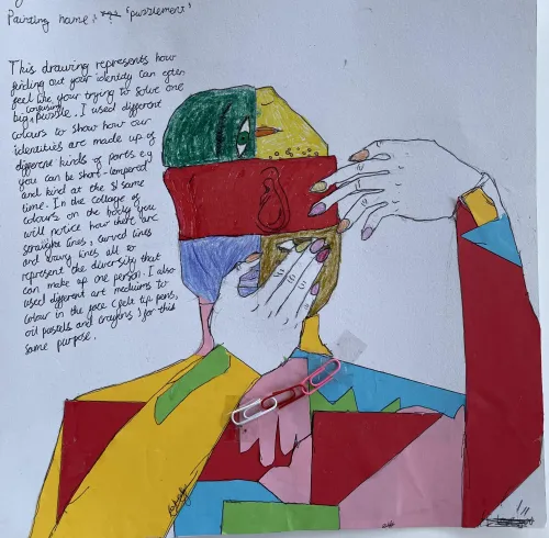 This drawing represents how finding out your identity can often feel like you're trying to solve one big, confusing puzzle. I collaged different colours together to show how our identities are made up of different parts, e.g. you can be short-tempered and kind at the same time. In the collage of colours on the body you will notice how there are straight lines, curved lines and wavy lines, all to represent the diversity that can make up one person. I also used different art mediums throughout, for this same purpose.