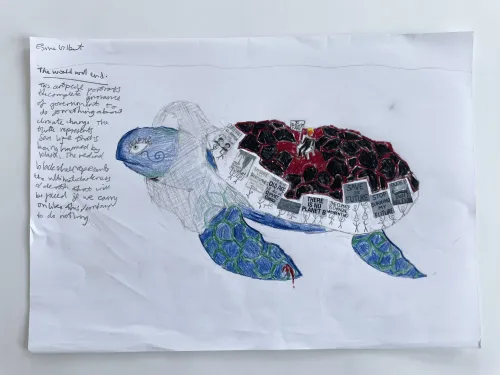This artwork portrays the complete ignorance of government to do something about climate change. The turtle represents sea life that is being harmed by plastic. The red and black shell represents the ultimate darkness of death that we will be facing if we carry on like this and continue to do nothing.