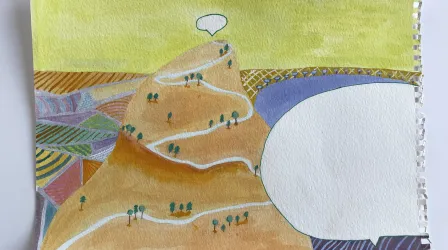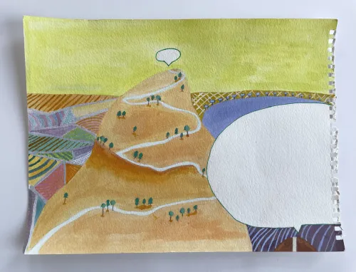 My piece displays the message of how ' the bigger the issue, the smaller the voice' and vice versa. The mountain displays the larger problems, with a small speech bubble, showing the small voices of those with larger issues. The molehill represents the smaller issues that are spoken about with larger voices that are amplified by social media. Those with the voice to speak about these problems are busy caring for people to have the time and energy to speak out and let the world know.