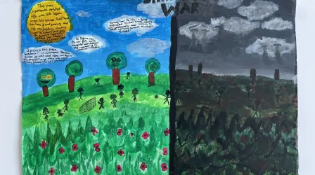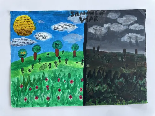 This piece represents what life was like before war. We can see that there are trees and greenery, and life was fulfilling. During war the clouds are grey, the greenery has been painted red, people's families have been torn apart. I picked this piece because it showcases two sides of war and opens an eye to the perspective of a boy who used to play games but now is obligated to fight. Before the war, the air is filled with laughter and children play unaware of the storm yet to come. During war the sky is being suffocated by thick smoke, dreams are swallowed by dust, leaving the earth trembling beneath the weight of death.