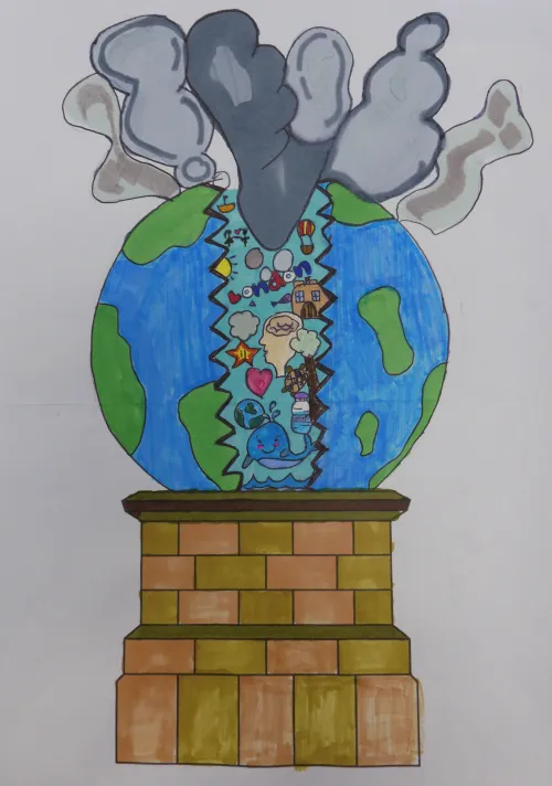This artwork shows the Earth splitting open, revealing a mix of nature, cities, and human life inside, while dark smoke rises from the top. It represents the balance between the beauty of our world and the damage caused by pollution and climate change. The bright, colourful symbols inside remind us of what we love and need to protect, while the smoke warns of the harm we are doing. It’s a call to care for our planet before it breaks apart.