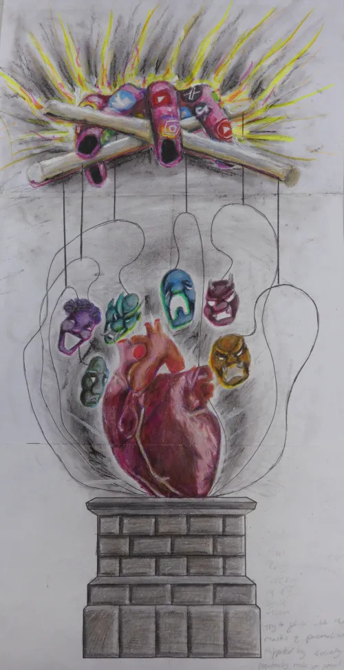 This artwork represents the struggle of individuality in a world dominated by digital influence and societal expectations. The marionette-like strings connect a raw, beating heart—symbolizing true self and emotions—to a set of colourful masks, each representing a different persona shaped by external forces. Above, the explosion of fingers marked with social media icons and symbols suggests how technology and society manipulate identity, forcing people to wear façades rather than embracing authenticity.