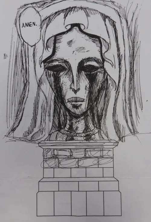 This artwork shows a sorrowful, veiled figure with hollow eyes, saying "Amen." It represents grief, faith, and silent strength. The rough lines add to the heavy, emotional feel, making us think about pain, belief, and unspoken prayers. Its an invitation to reflect on loss and resilience in difficult times.