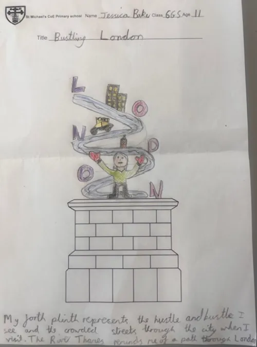 My Fourth Plinth Art Challenge features a London Eye sculpture decorated with famous city symbols. It includes a mini–Big Ben, a British umbrella, a Union Jack, classic London bus, red telephone box and a crown representing the importance and honour of the royals in London life this piece celebrates London’s history and culture and captures the city’s unique spirit in a fun and eye-catching way.
