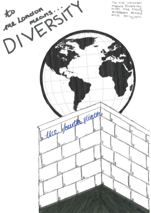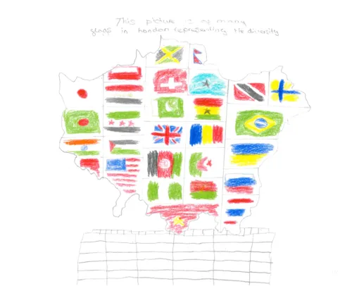 This drawing represents the diversity in London and how people from different cultures coexist in the city.