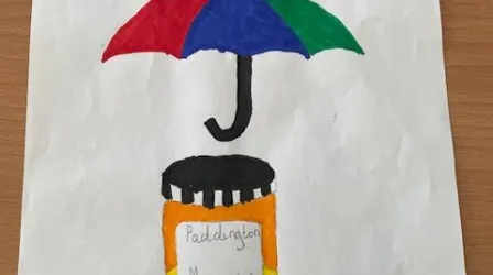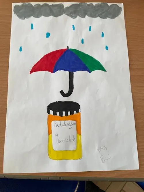 A rainy day drawing with an umbrella covering Paddington's marmalade