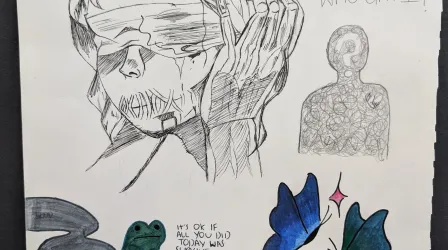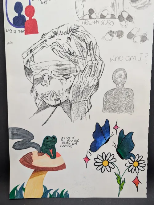Mental health surrealist artwork in pen, pencil and marker. Depicting the tragic headspace of someone who is experiencing mental heath episode.