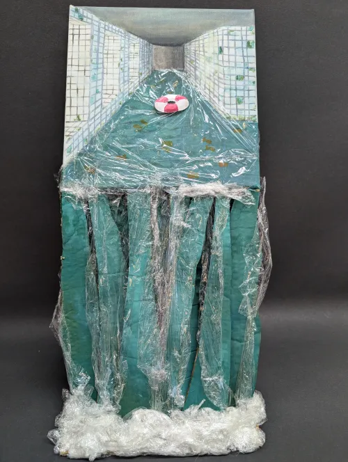An ominous swimming pool that escapes the 2d space and become a 3d water fall. This work presents dreams escaping and becoming a reality.