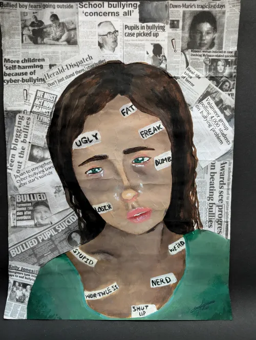In the foreground there is a painting of a young girl; who is crying with words on her face. The words are names that people call her during the day.