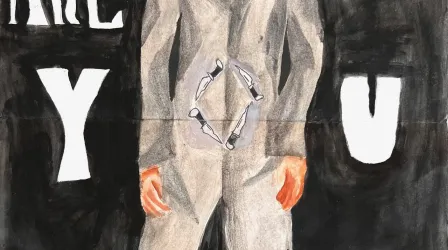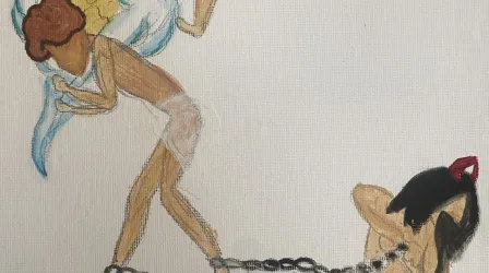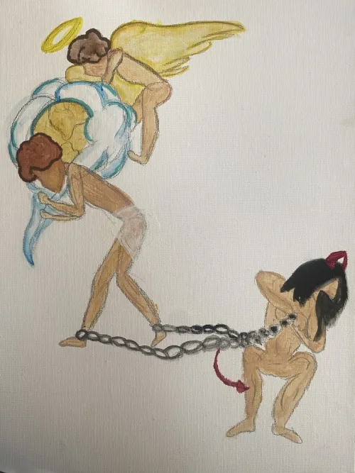 The artwork depicts the struggles of the main subject carrying the weight of the world on their shoulders. They are being pulled back and trapped by their demons, but with the help of an angel and Faith the heavy load seems that little bit lighter.