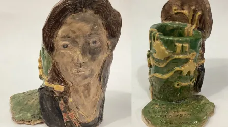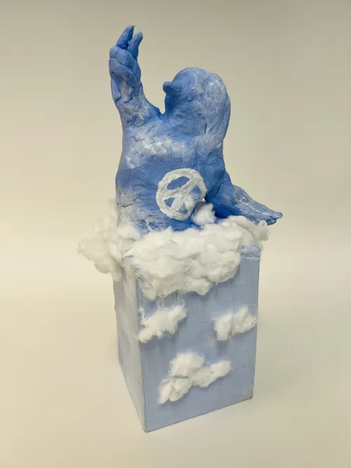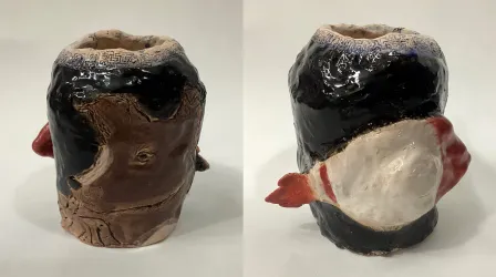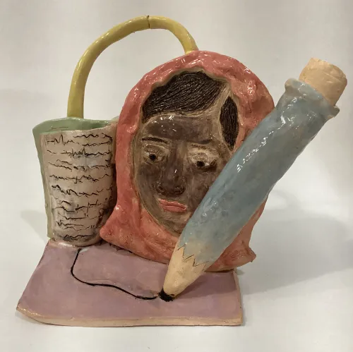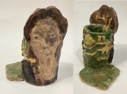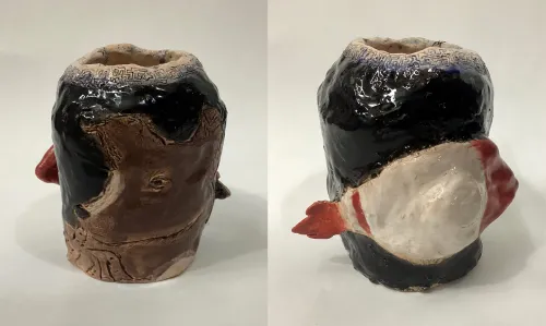 The canine who went to space is a sculpture that honours Laika and the sacrifices she made that overall helped with space technology today. I used the slab technique to build the pot and then added more clay to carve into a spaceship to represent her. I used sgraffito to carve a portrait of her into the clay.