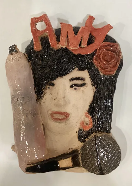 This piece celebrates Amy Winehouse, one of the most iconic and influential singers of her generation. Known for her powerful voice, unique style, and deeply personal lyrics, Amy broke boundaries in music and left a lasting legacy. I chose to honor her because she inspires people through her creativity and individuality, despite the challenges she faced in her life. To make this piece, I sculpted her face and signature beehive hairstyle onto a clay tile, adding details like hairspray and a microphone to symbolize her love for music and her bold personality.