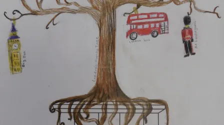 This artwork represents London’s deep-rooted history and culture through a grand tree growing from a strong foundation. The branches hold iconic symbols of the city, such as Big Ben, a red double-decker bus, and a Queen’s Guard, showing how these elements are connected to London’s identity. The tree’s roots symbolize the city's rich past, while its branches reaching outward suggest growth and evolution. This piece reflects the idea that London’s heritage continues to shape its future.