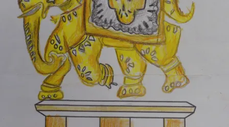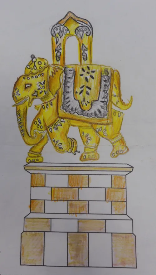 This artwork represents strength, wisdom, and cultural heritage through the image of a majestic golden elephant. Decorated with intricate patterns and a royal carriage, the elephant symbolizes tradition, power, and prosperity. Its placement on a grand pedestal highlights its significance, reminding us of the deep connections between history, art, and identity.
