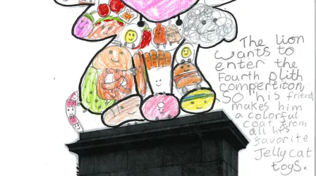 The Lion wants to enter the Fourth Plinth competition so his friend makes him a colourful coat from all his favourite Jelly Cat toys!