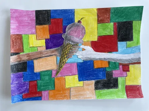 This artwork represents two social issues. The first being friendship, friendships in school is a big issue. Many find it hard to make friends. So, this picture represents the fact that a small gesture can start a friendship. As well as this, it shows that giving (no matter what) to people in need can make a big difference. The colourful background of my piece shows diversity.