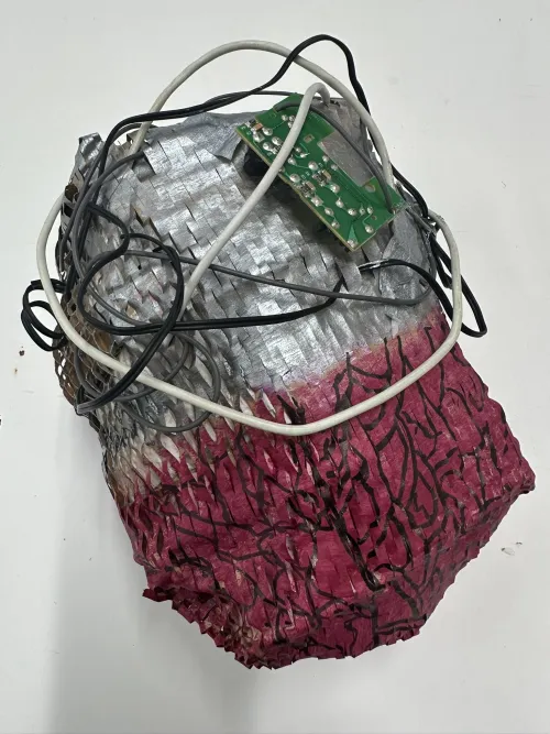 This papier mache model of a brain signifies that the power of AI is taking over our brain as one half of the brain is normal, but the other half has wires, chips and a circuit on it. We must balance the power of AI as well as our normal brains. AI is good as it allows us to do lots of cool things like change images and do calculations for us but AI can also give us false information, so you've got to check one or two sources to get the right answers. Just remember that humans coded AI so humans will be more powerful!