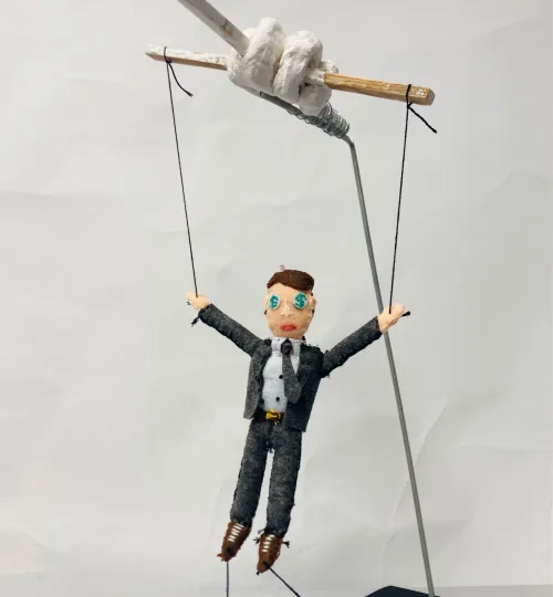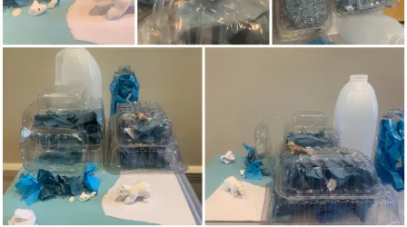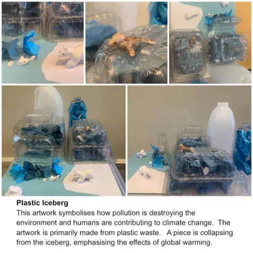 This artwork symbolises how pollution is destroying the environment and humans are contributing to climate change. The artwork is primarily made from plastic waste. A piece is collapsing from the iceberg, emphasising the effects of global warming.