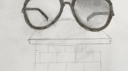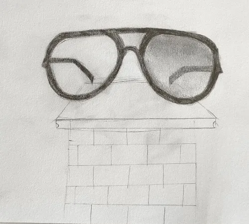 Sunglasses have tinted lenses which makes everything less vibrant that it is in reality. The left side of the glass does not have any lenses and therefore it is possible to see the real world as it is. The dark lenses represent the vengeance and jealousy that distort our views on life.