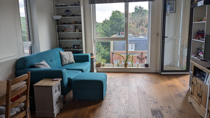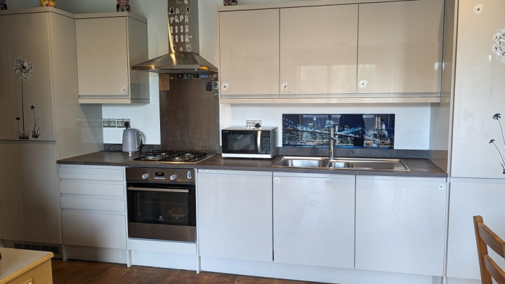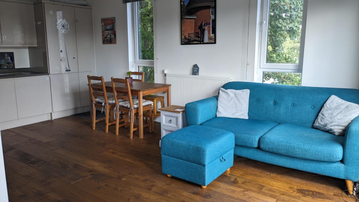 This is a spacious dual-aspect flat with an open plan kitchen/living room with access to a south facing balcony.