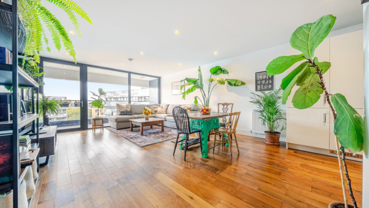 Enter this beautifully presented, stylish, dual aspect apartment via a spacious central hallway with storage. Find a contemporary family bathroom to your right, together with three double bedrooms, the master having benefit of a built in wardrobe and an ensuite shower room. The well proportioned living area is on the other side of the apartment, and leads to a private covered balcony, which overlooks the landscaped communal courtyard. The two tone modern kitchen incorporates fully integrated appliances including a brand new LG washing machine.