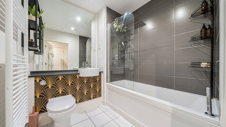 - Bathroom with shower over bath