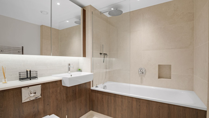 The spacious double bedroom is beautifully finished with a textured feature wall and soft neutral tones, opening onto a private winter garden that adds both light and calm to the space. The bathroom is contemporary and well-appointed, with a minimalist finish and quality fittings.