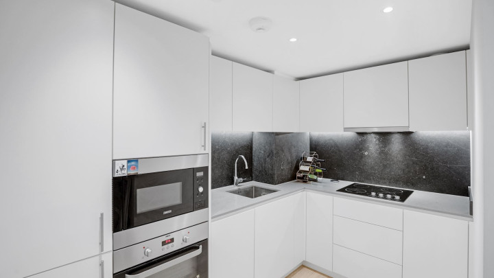 Thoughtfully designed, the home offers a bright open-plan living and dining space with floor-to-ceiling windows, breathtaking views of the canal and Canary Wharf skyline, elegant finishes, and warm natural light throughout. The sleek kitchen features integrated appliances, clean white cabinetry and a dark stone backsplash for a striking modern look.