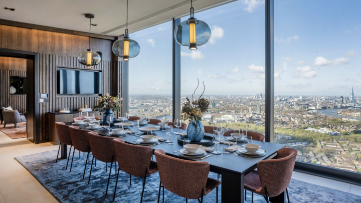 As a resident, you'll enjoy world-class amenities including a 24-hour concierge and security, London's tallest gym on the 56th floor with panoramic Thames views, a private cinema, beautifully designed lounge and dining spaces, and the 75th-floor roof terrace offering spectacular 360° views of London.