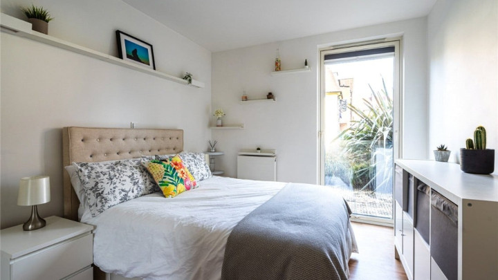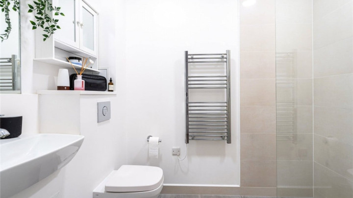 The double bedroom features mirrored built-in wardrobes and also includes a window that opens out to the front garden area, creating an airy, inviting feel. The bathroom is finished with sleek tiling and a generous walk-in shower. There's also a useful hallway cupboard housing the heating system and offering additional storage.