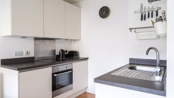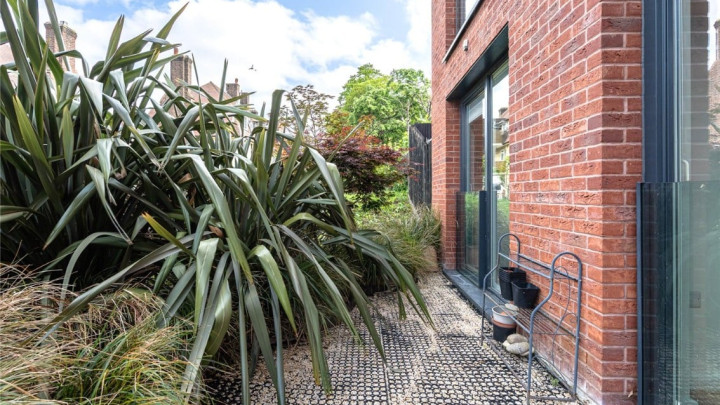 Internally, the home opens to a well-proportioned open-plan kitchen/reception room with ample space to dine. A contemporary fitted kitchen and Juliet-style window facing west invite plenty of natural light and provide a lovely spot to enjoy the afternoon sun.