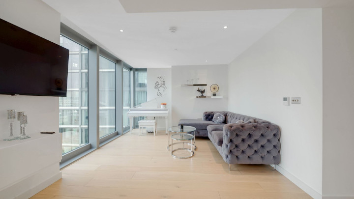The expansive open-plan reception room is flooded with natural light through floor-to-ceiling south-facing windows, framing panoramic views over South Dock and the iconic Canary Wharf skyline. A private Juliet balcony extends the living space, creating a seamless connection to the city below. The modern kitchen features sleek matte white cabinetry and fully integrated appliances.