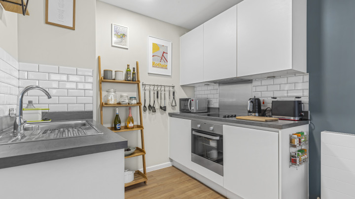 The kitchen includes integrated appliances such as a fridge, freezer, hob, oven, and extractor.