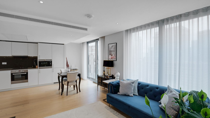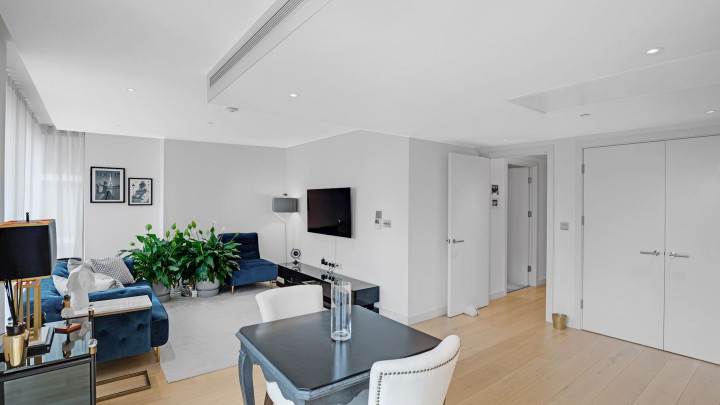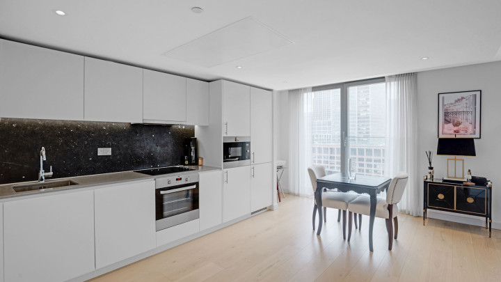 The stylish open-plan reception area features engineered wood flooring and flows seamlessly into a sleek fitted kitchen with integrated appliances and elegant cabinetry, making it ideal for both everyday living and entertaining. The dining area enjoys stunning city views and access to abundant light.