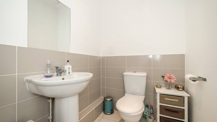 As you walk through the hallway, you will next come to the downstairs WC, has white walls and cream wall and floor tiles.
