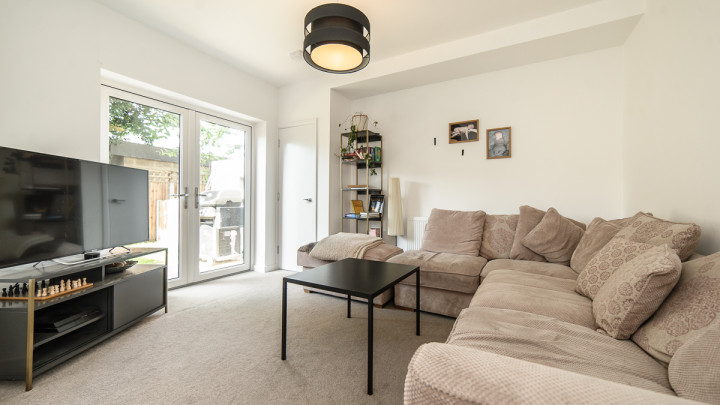 Moving along, is the reception/living room featuring light coloured walls and cream carpeting. This living room area is of a great size and has plenty of floor space for your sofa, coffee table, TV storage unit. Also benefits from French doors leading on to the garden.