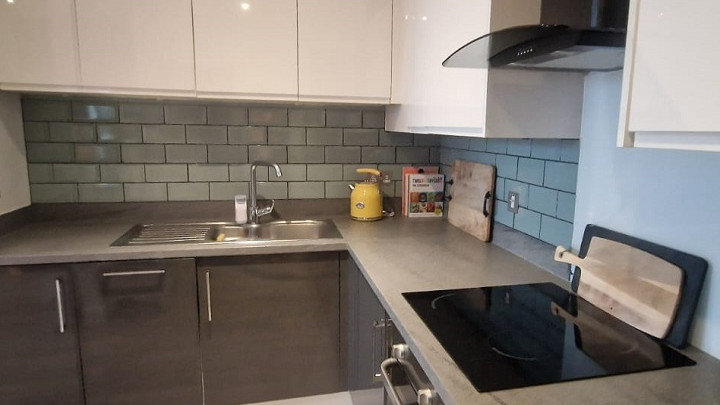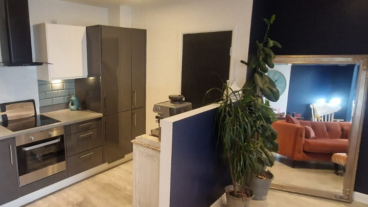 - Fitted Manhattan kitchen with a mix of contrasting wall and base units in high gloss, integrated fridge freezer, built-in oven and ceramic hob with extractor hood above, 1½ bowl stainless steel sink and drainer, integrated dishwasher