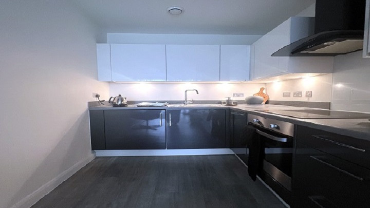 - Fully fitted Manhattan high gloss kitchen, white and anthracite split, with glass splashback. Integrated appliances (fridge freezer, washer dryer, oven, ceramic hob and glass cooker hood.).