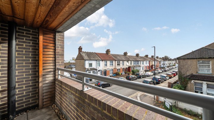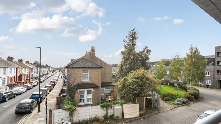 This dual aspect apartment comprises a reception room with access to a private east facing balcony, a separate kitchen, two double bedrooms, each with fitted wardrobes and a family bathroom.
