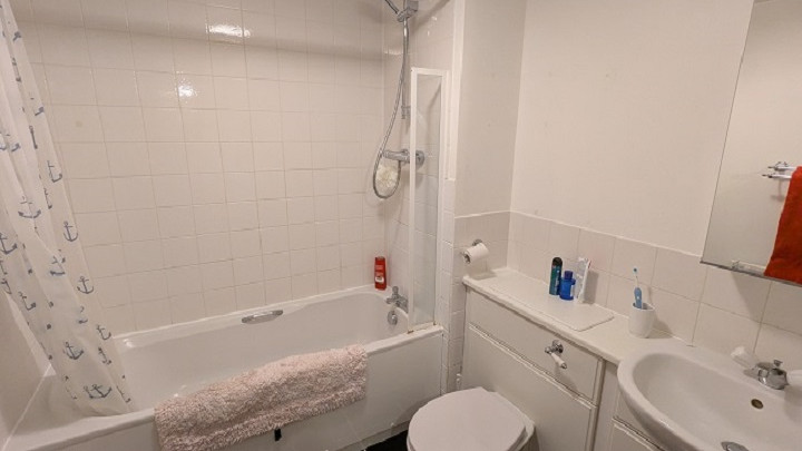 - White finish bathroom/WC with bath plus overhead shower with screen