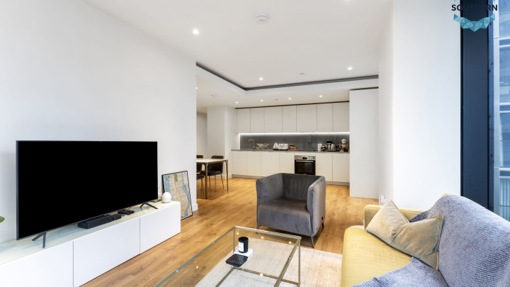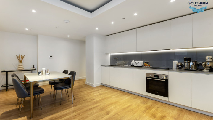This ninth‑floor two‑bedroom flat in the highly sought‑after Hampton Tower development offers a superb open‑plan kitchen and living space. Floor‑to‑ceiling windows flood the room with natural light while the kitchen is fitted with high‑quality integrated appliances, making it the ideal space for relaxing, entertaining and everyday living.