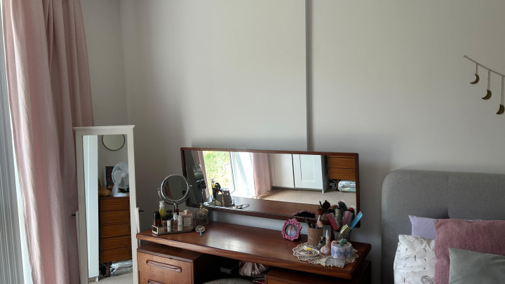 Wood flooring throughout the living and dining area and tiled flooring in the bathroom and storage cupboard. Carpeted throughout the bedroom, which is of generous proportions with ample space for multiple wardrobes.