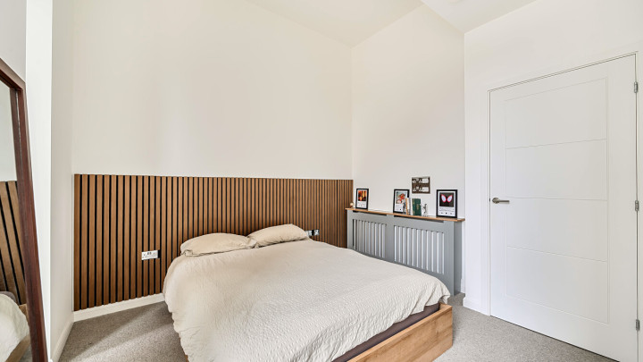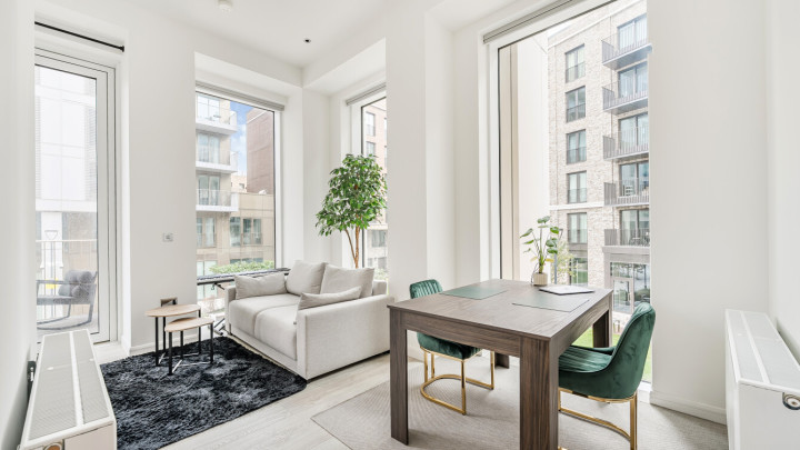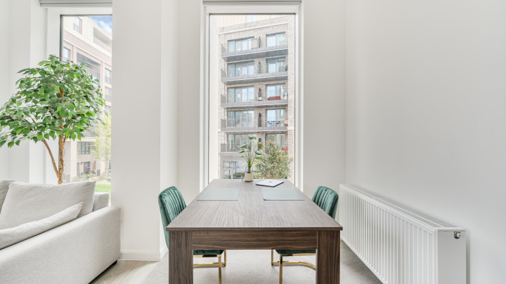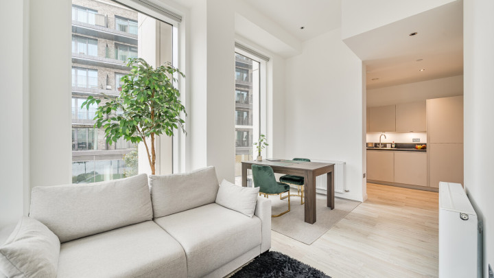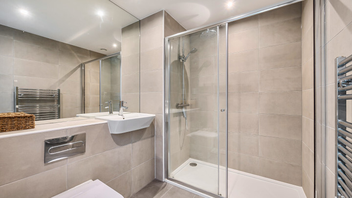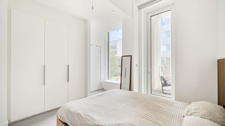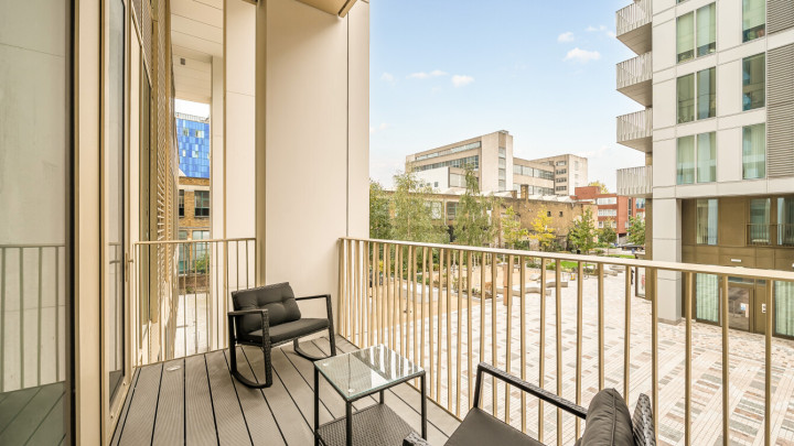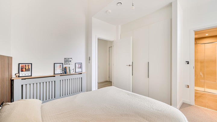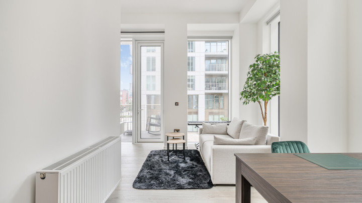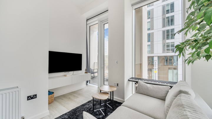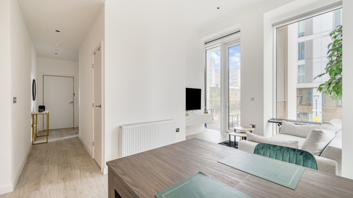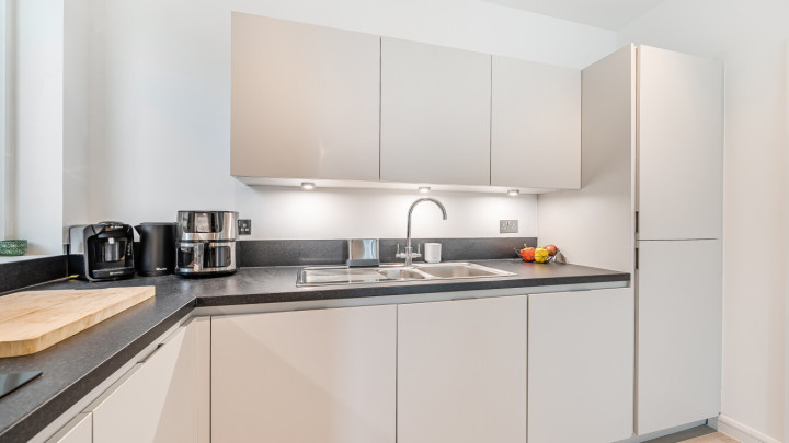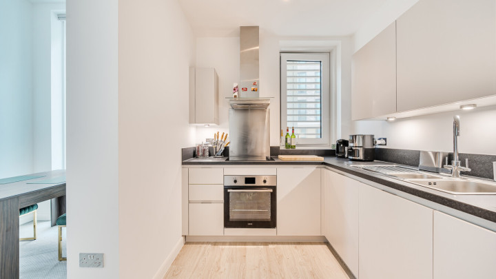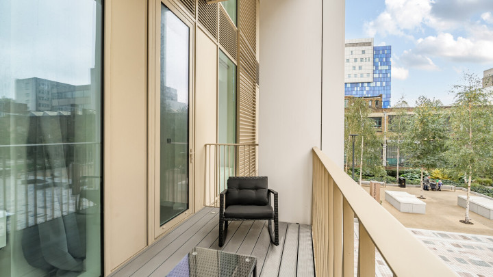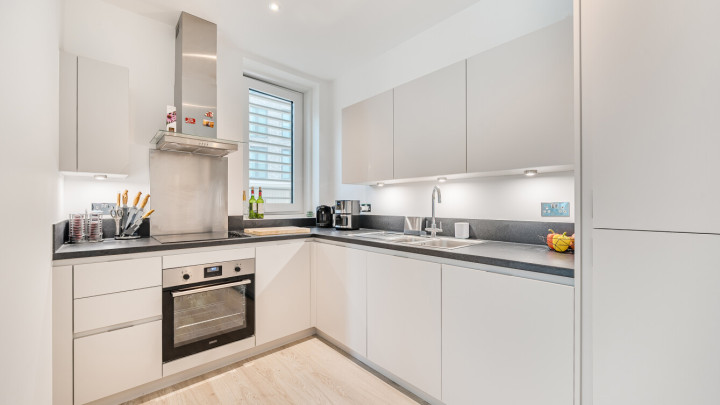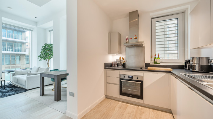 Welcome to this beautiful good sized stylish apartment designed for modern living. The whole is apartment is full of natural light with soaring ceilings and open plan living aspect. There are ceiling to floor windows. This area opens out onto a lovely private balcony which is good for relaxing and entertaining. The kitchen is modern and with light grey units and dark grey marble effect work-tops. There is also the benefit of intergrated appliances. There is ample room for a good sized dining room table and sofa within the open plan living area. The double bedroom has a beautiful en-suite bathroom. The ensuite has a large shower, sink and wc. Every detail has been considered, from the high quality finishes to the automated blackout roller curtains in every room combining comfort, convenience and elegance.