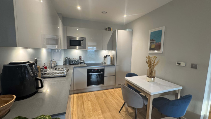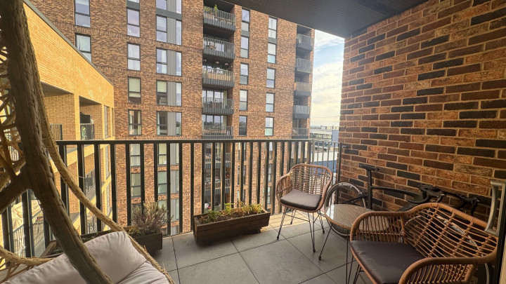 Located in a contemporary development in the heart of Earlsfield, this beautifully presented 1-bedroom, 1-bathroom apartment offers stylish and modern living. The property features a spacious open-plan living and kitchen area with floor-to-ceiling windows, flooding the space with natural light and leading onto a private terrace, perfect for morning coffee or evening relaxation. The sleek kitchen comes fully equipped with integrated appliances, while the bedroom includes a fitted wardrobe providing ample storage. The apartment also benefits from underfloor heating, a concierge service, 24-hour security, and access to a secure underground bike store.